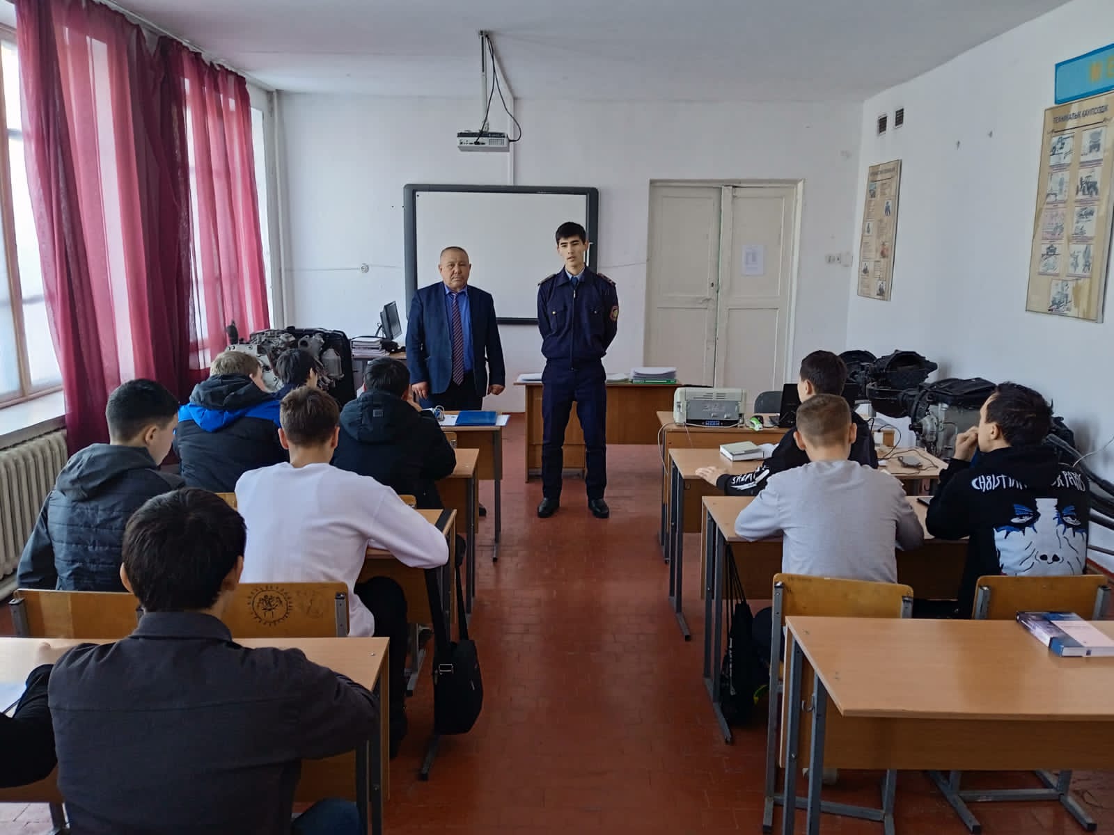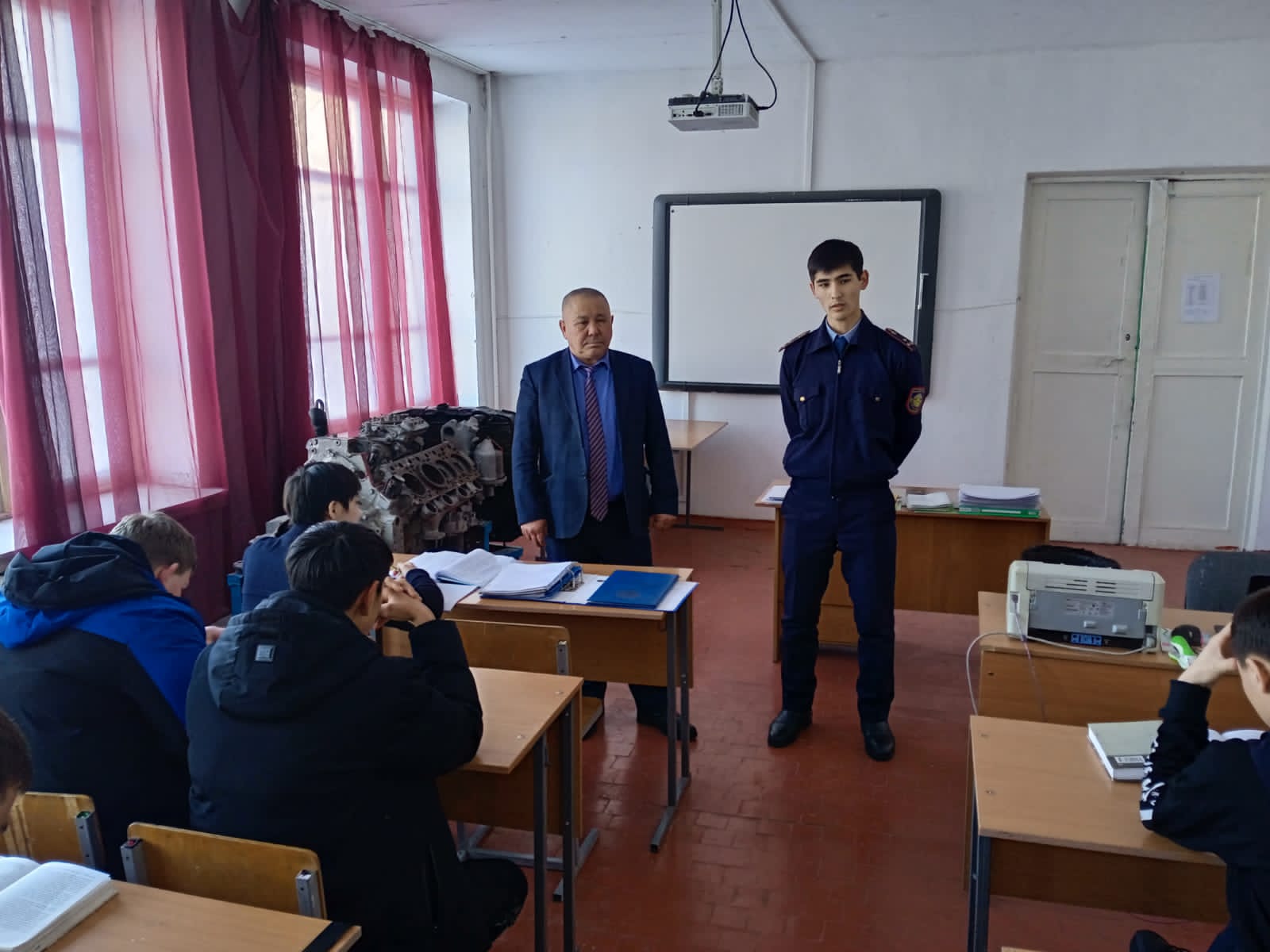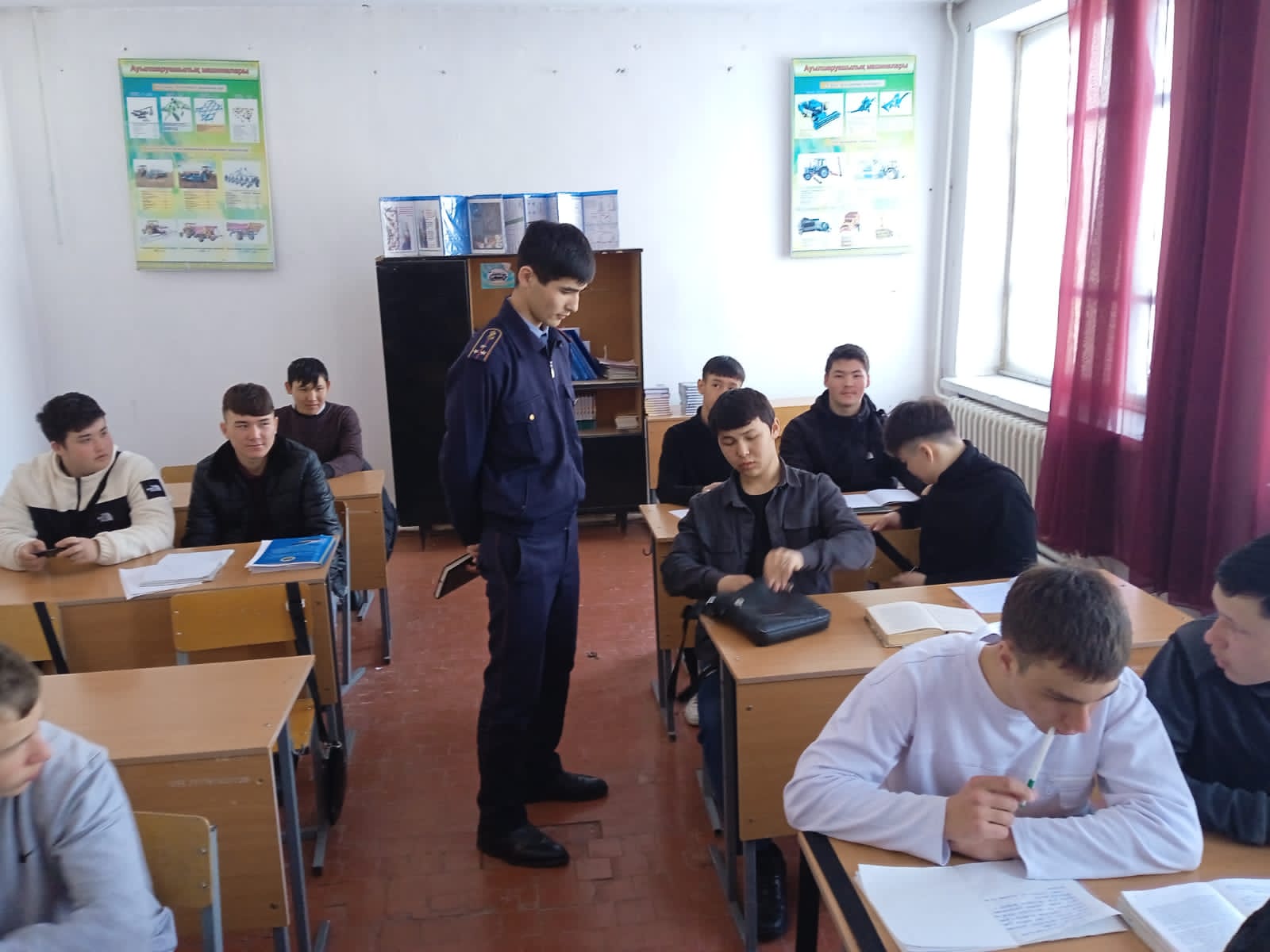 20.02.2023 Алакөл көпсалалы колледж студенттеріне «Құқық бұзушылықтың алдын алу-басты міндет» яғни зорлық-зомбылықтың алдын-алу және оларды болдырмау, бопсалау әрекетін, бөтеннің мүлкін ұрламау қылмыстарының алдын алу тақырыбында ювеналды полиция тобынын инспекторы, полиция аға лейтенанты Жармухамбетов Елдар Байсұңқарұлы түсіндірме жұмыстарын жүргізді.